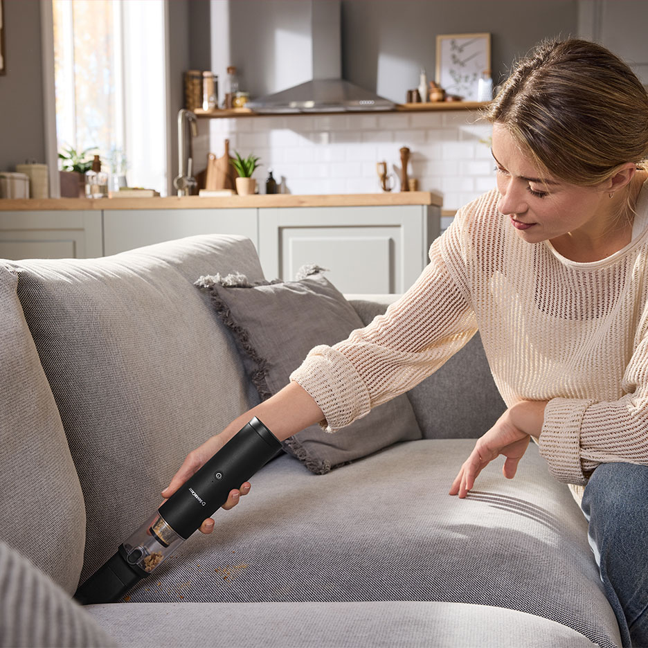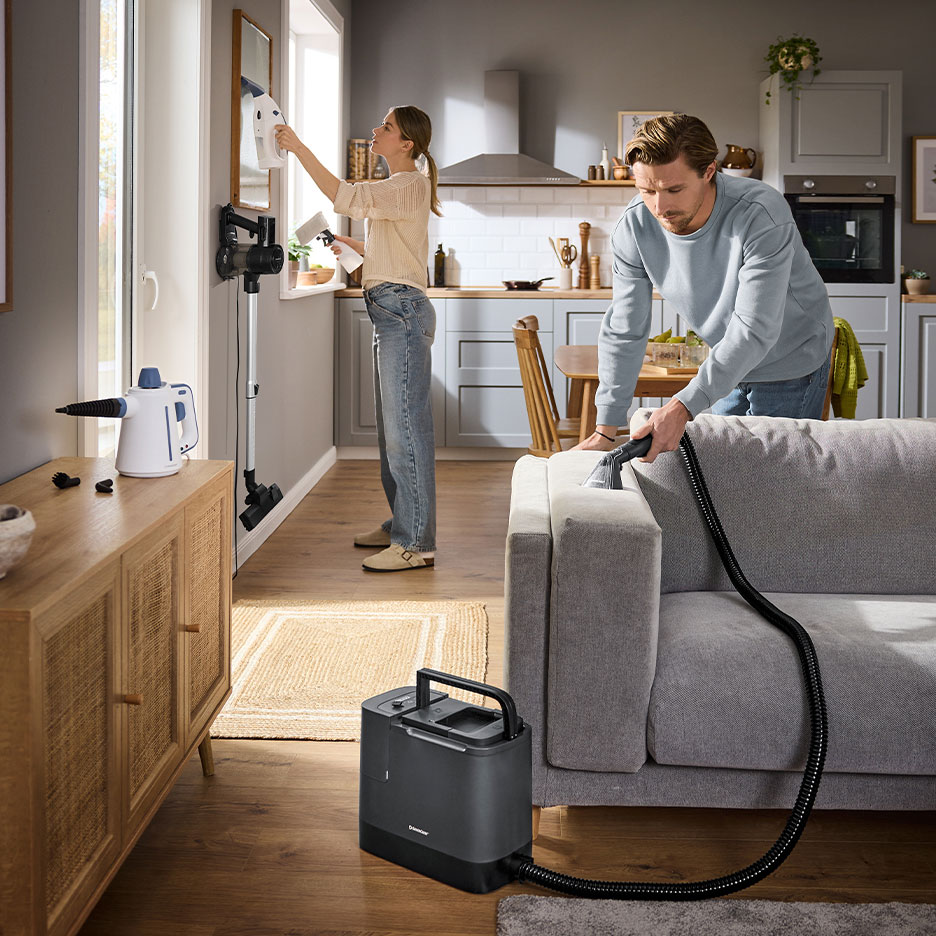 Steam cleaners use steam, which is heated to around 150 degrees, to reliably kill germs and dust mites - ideal for allergy sufferers. The steam penetrates deep into the upholstery and removes stubborn and ingrained dirt as well as unpleasant odours.use your steam cleaner with a suitable fabric cover. This distributes the steam, prevents scratches and traps dirt. After cleaning, you can put the cover in the washing machine Important: Before using the steam cleaner, always check whether your upholstered furniture is designed for it. Look at the care recommendation and do a test on a non-visible area. Otherwise fibres or the colour may come loose from the fabric.