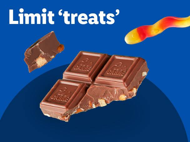 Tip 5 - Limit 'treat' foodsGo small and less often for treat foods such as chips, crisps, chocolate, cakes, biscuits, soft drinks and butter.