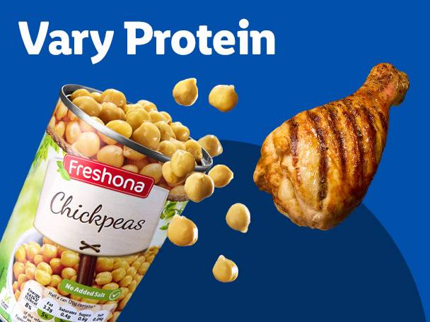 Tip 3 - Vary your protein intakeTry plant-based proteins: Beans, pulses, nuts & seeds. If opting for animal proteins, choose eggs, fish & lean meats.